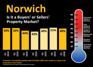 Understanding whether the current property market favours buyers or sellers is key to making the right call. If you follow my regular Norwich property market updates, you will know one of the most dependable ways to assess the property market is by observing the percentage of homes marked as “Sold STC” or “Under Offer” compared to the total number of properties on the market.
