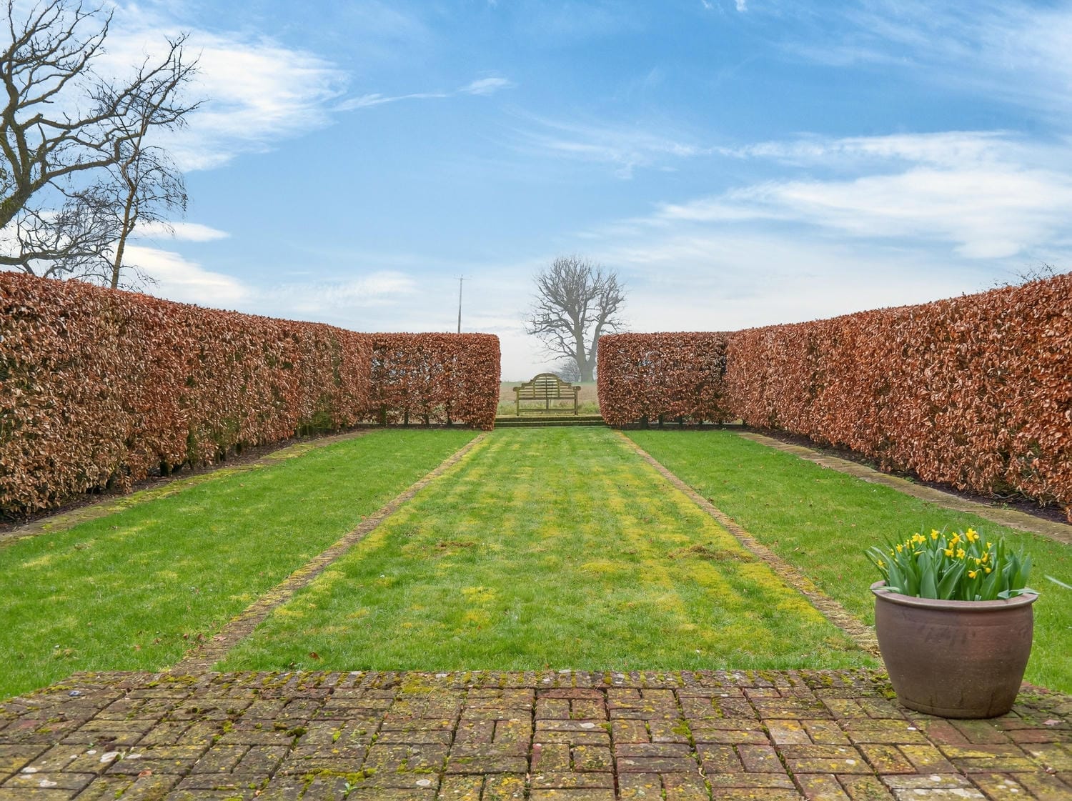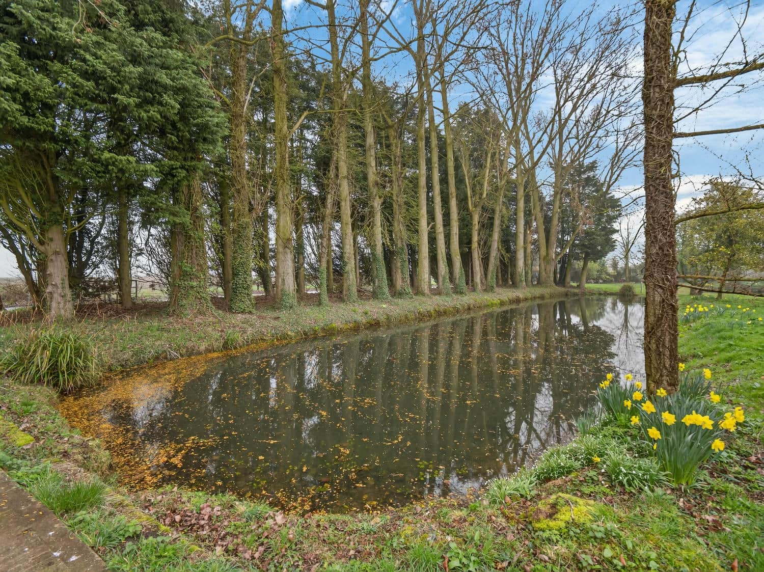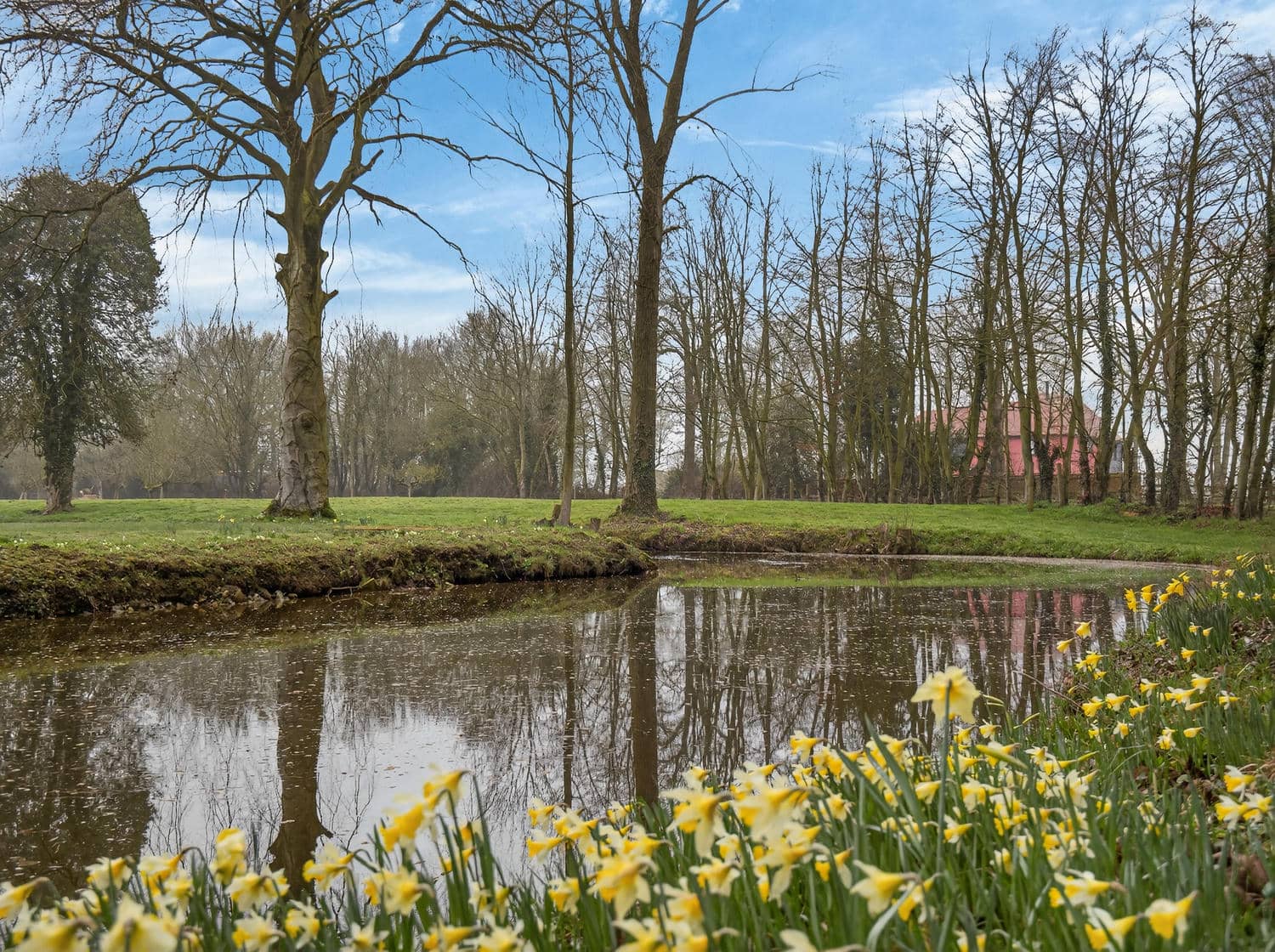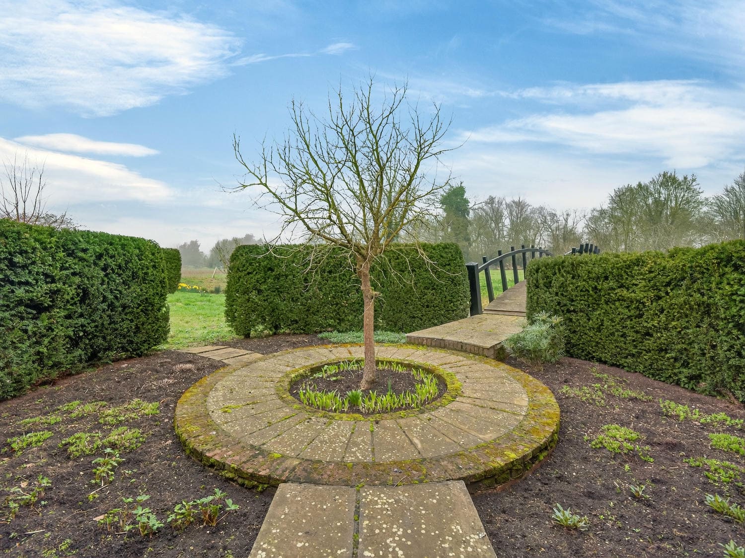 The grounds extend to approximately 3.6 acres. A tree-lined approach crosses the moat. Formal lawns sit alongside orchard and meadow. Mature planting creates distinct garden areas.