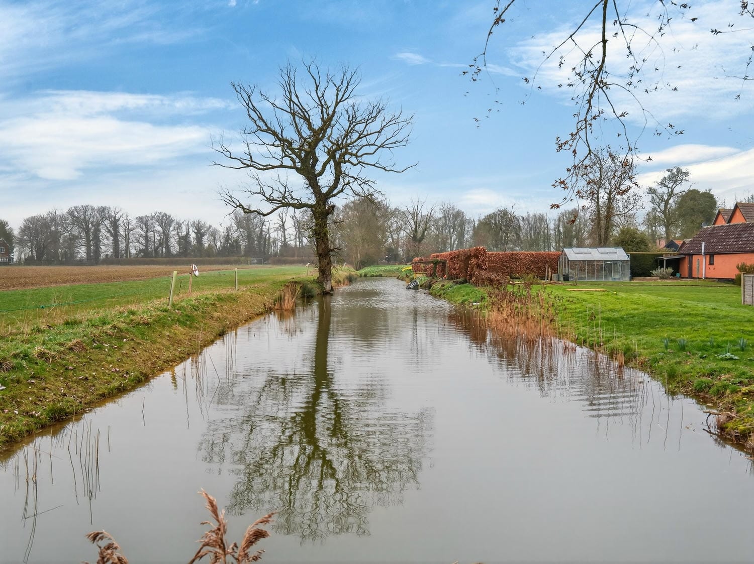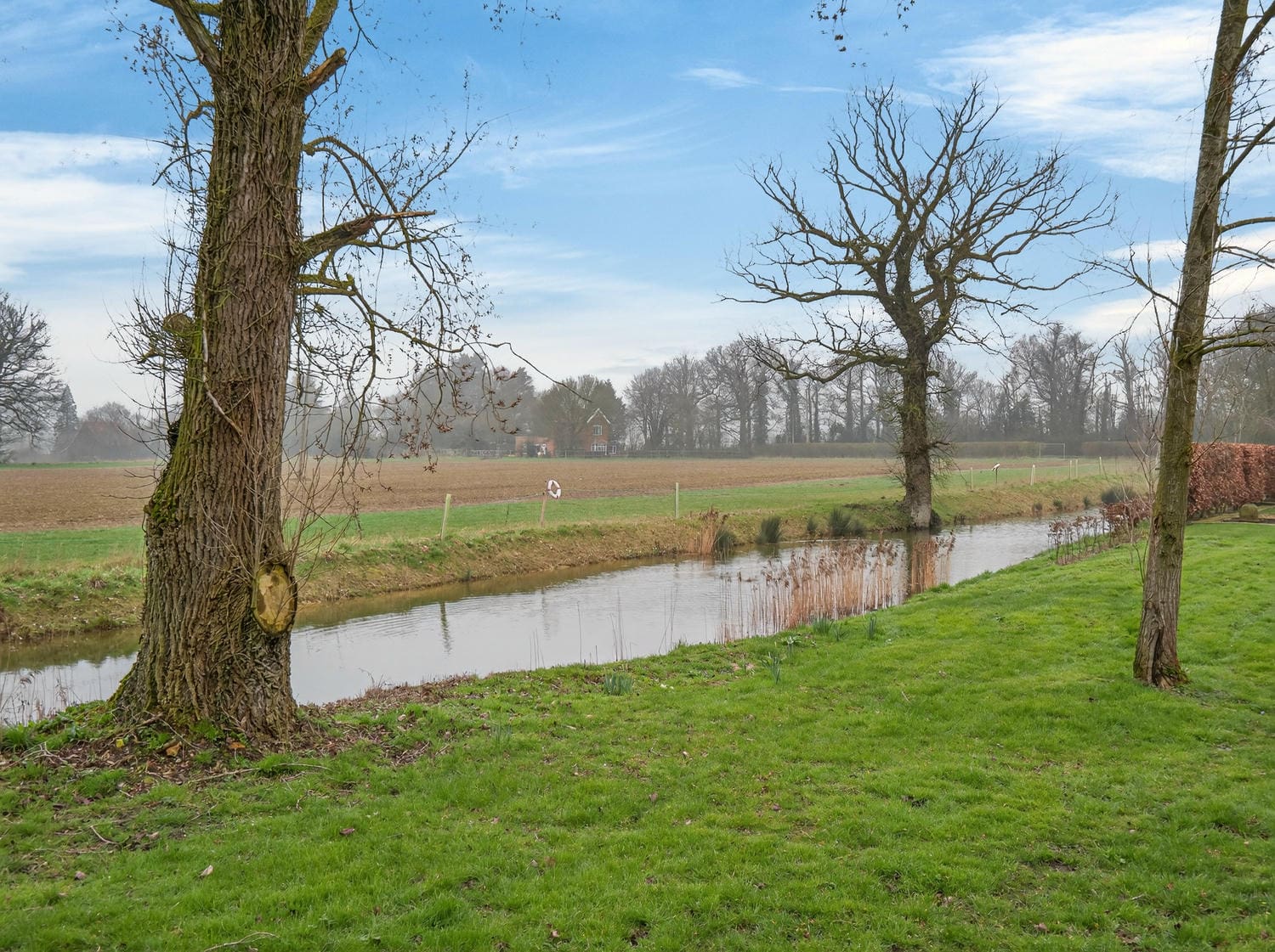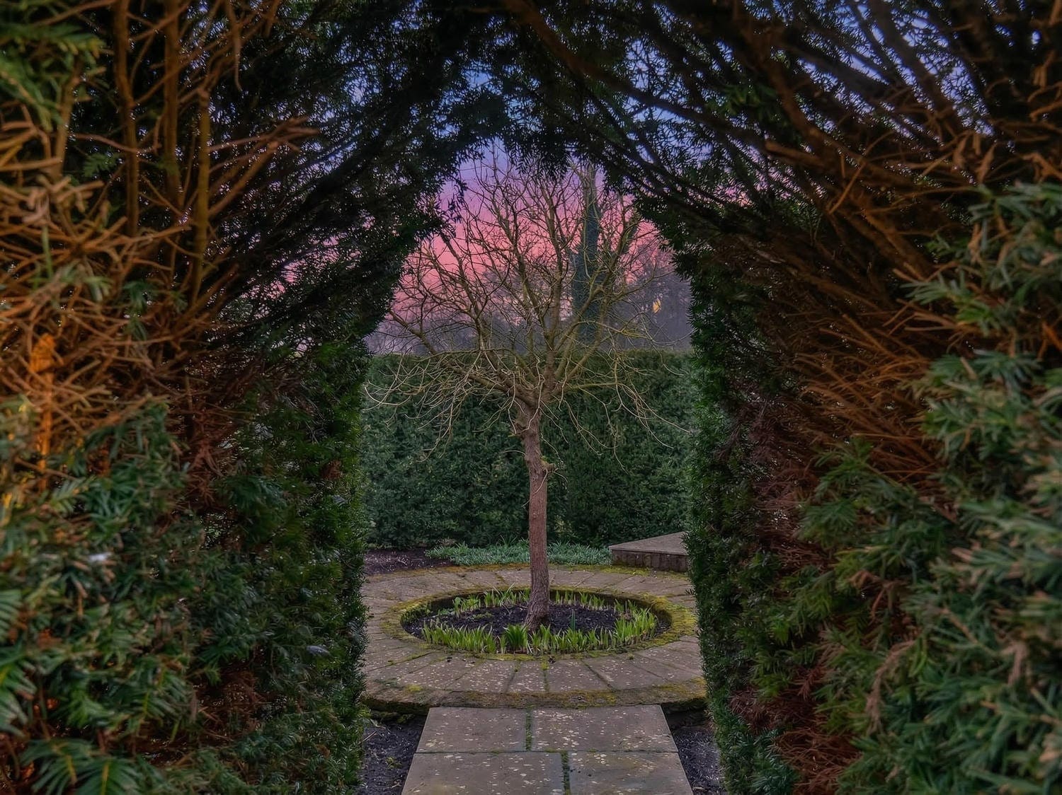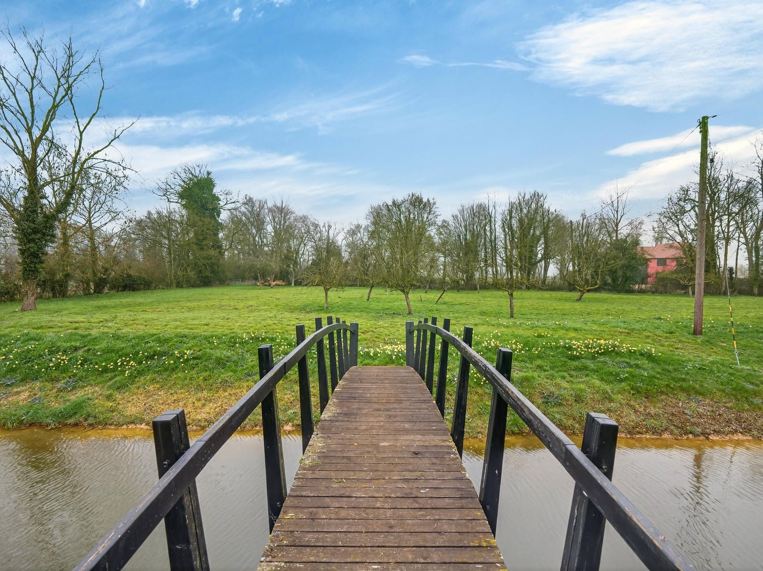 The grounds extend to approximately 3.6 acres. A tree-lined approach crosses the moat. Formal lawns sit alongside orchard and meadow. Mature planting creates distinct garden areas.