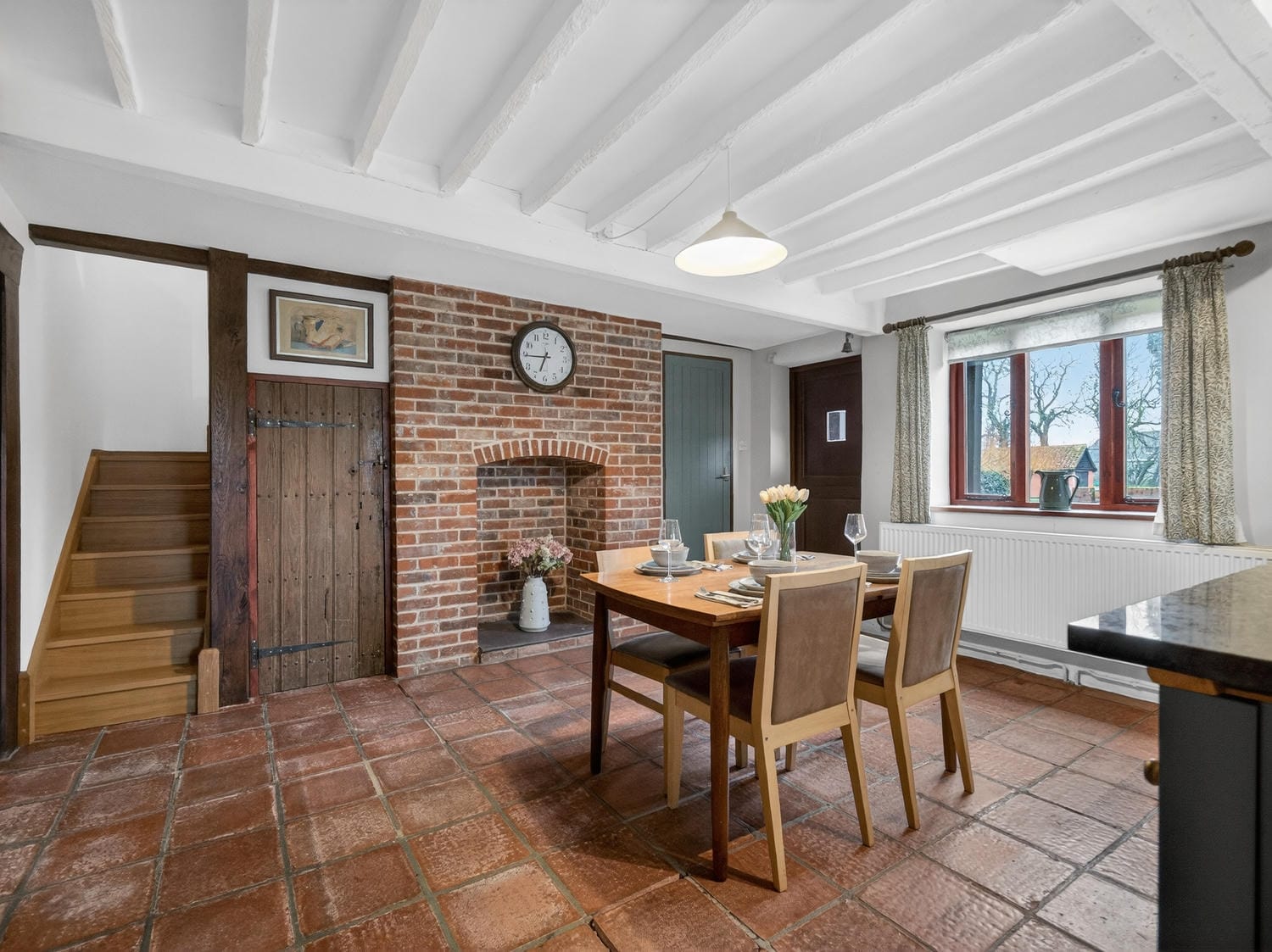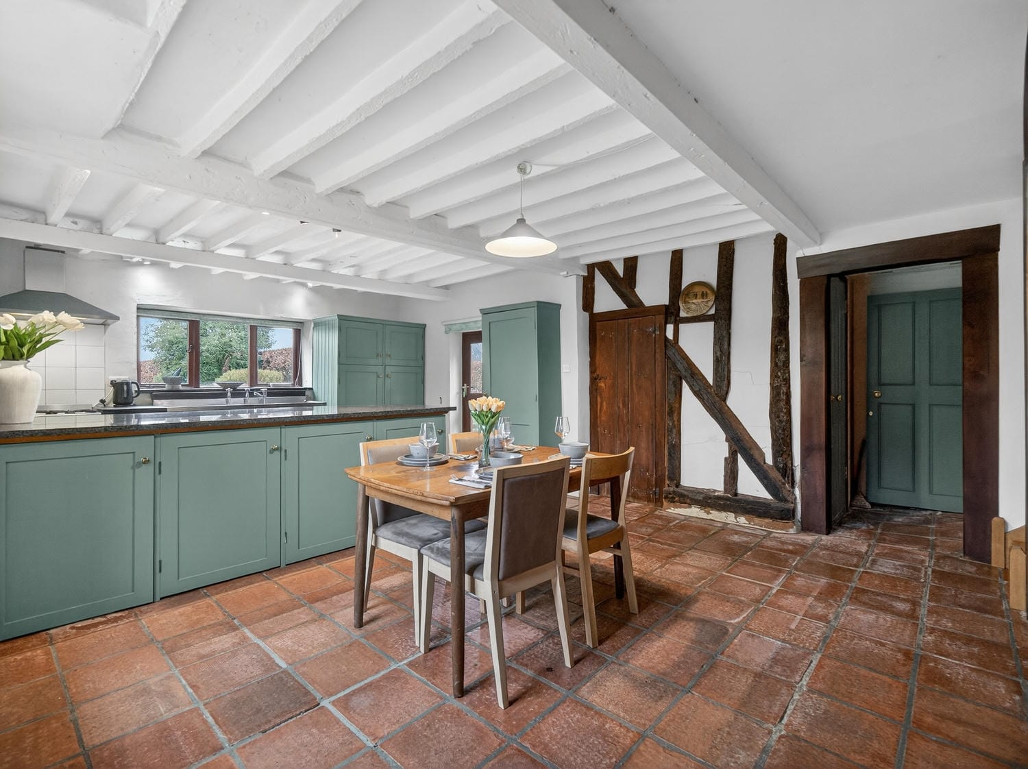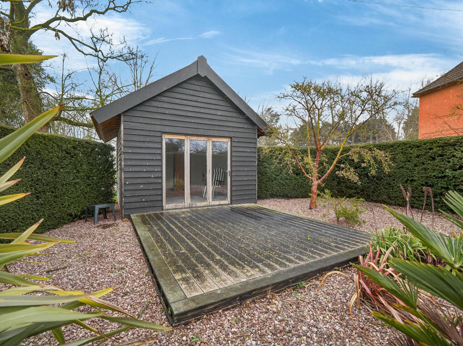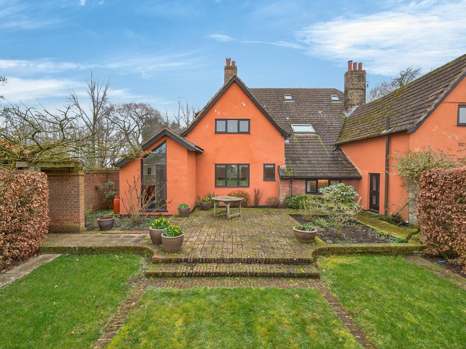 The garden house includes a kitchenette and connects via glazed link to a private Mediterranean-style courtyard. It suits home working, consulting space or further rental use. Access to the A140 supports commercial flexibility.