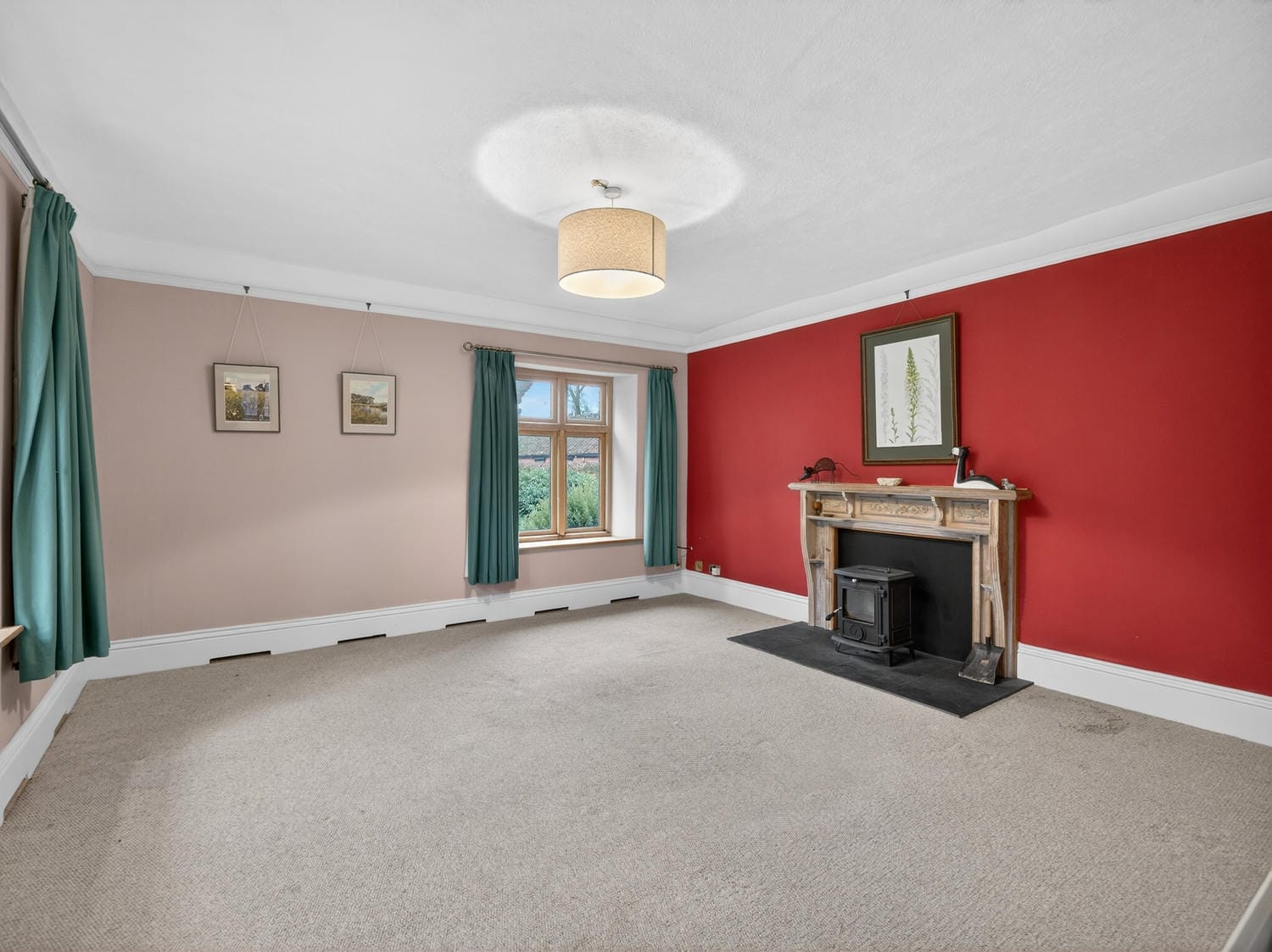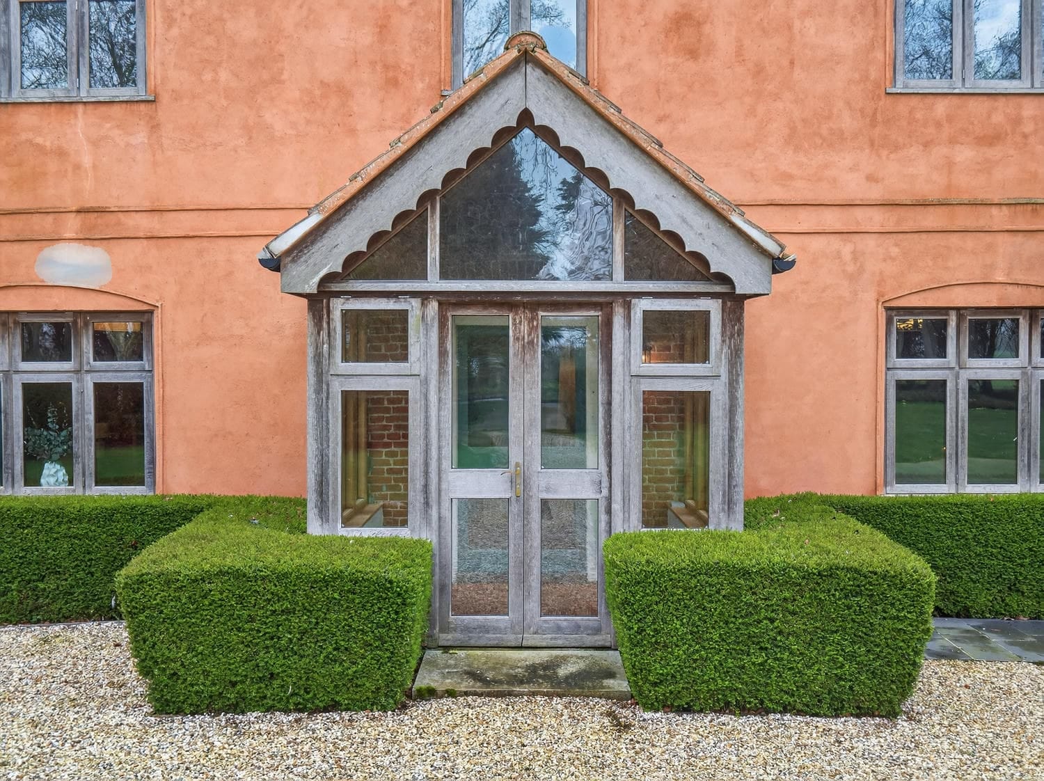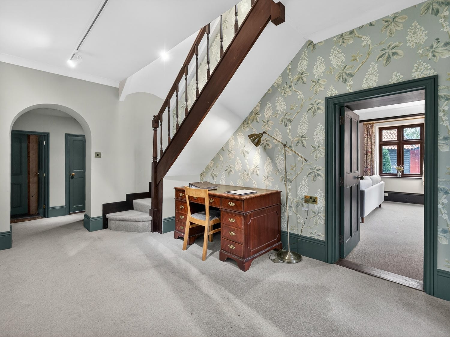The house is red brick beneath render with later additions. Accommodation spreads across multiple levels. The layout currently provides four to five bedrooms, three to five reception rooms, attic rooms and an integral annexe wing.