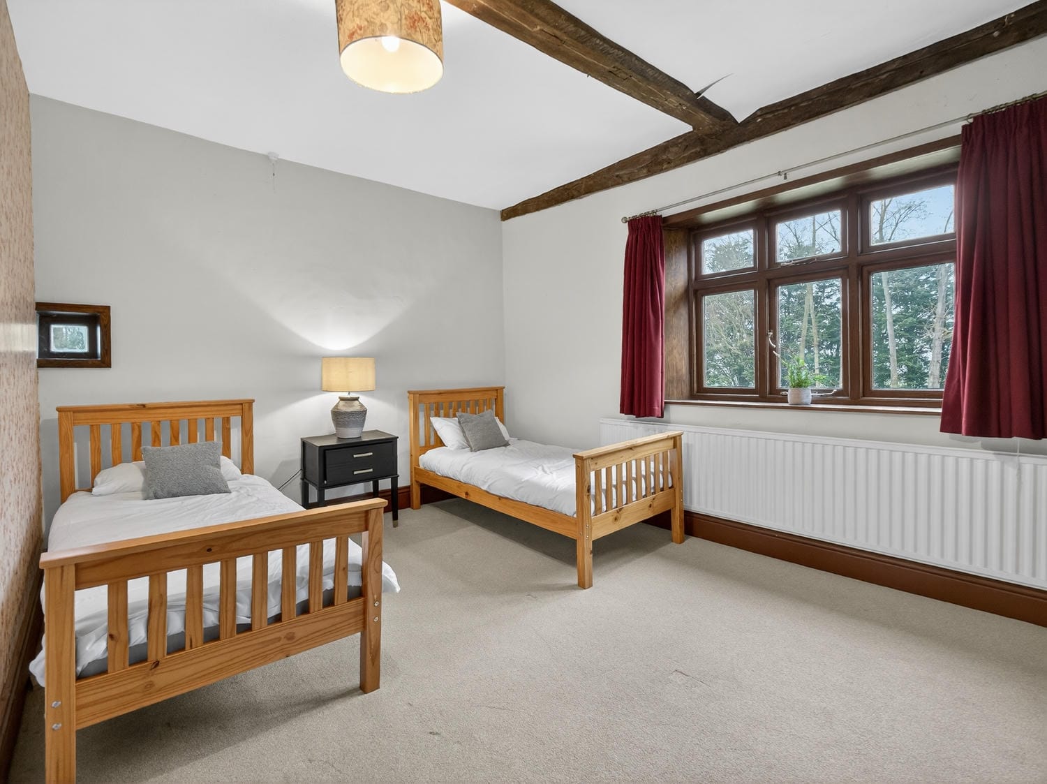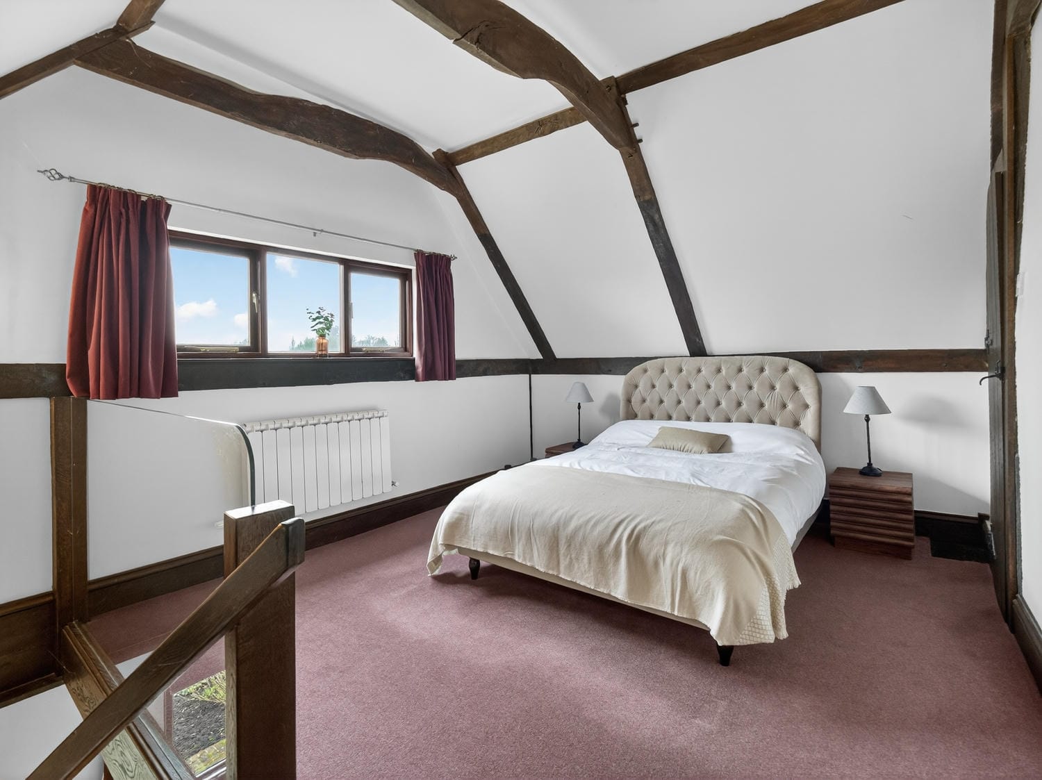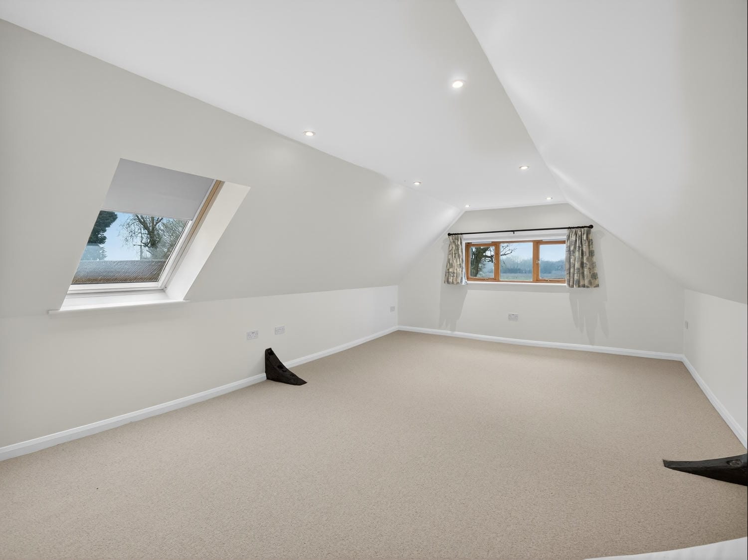 The house is red brick beneath render with later additions. Accommodation spreads across multiple levels. The layout currently provides four to five bedrooms, three to five reception rooms, attic rooms and an integral annexe wing.