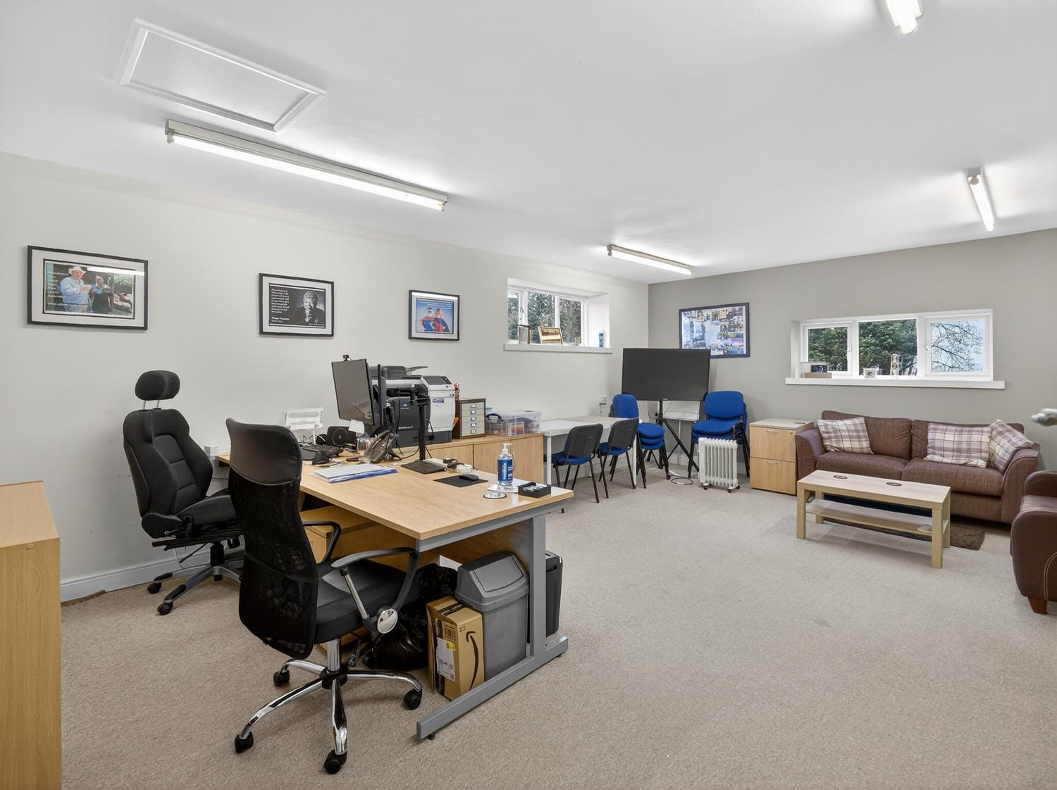 Beyond the farmhouse sits a Workshop Cottage annexe of approximately 624 sq ft. A substantial barn workshop provides power and roller access. A courtyard area includes commercial office and workshop units.